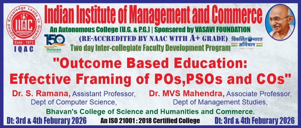 The Indian Institute of Management and Commerce(IIMC) established five decades ago(year 1973) has to its credit some outstanding achievements in the field of Commerce Education in general and Honours course in particular at the Degree level. Eminent social workers and philanthropists and Educationalists like Sri Kothuru Seethaiah Gupta, Sri Challa Som Raj Ram, Sri C.E. Gupta, Sri Dundoo Balanarasaiah, Sri Narayana Chetty IAS(Retd.), Late Sri Veloor Lingaiah Gupta gathered together and laid solid foundation in starting this premier Institution. Members of Vysya Community in particular and admirers of Higher Education in general are greatly beholden to the Founders.