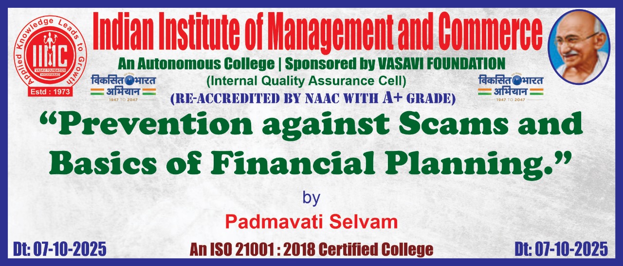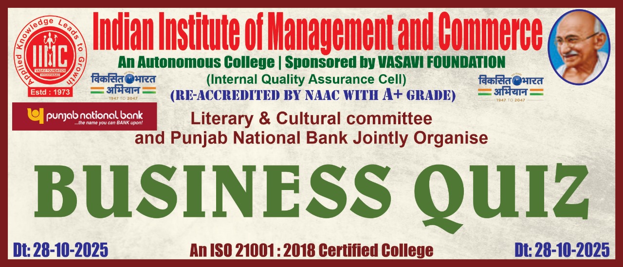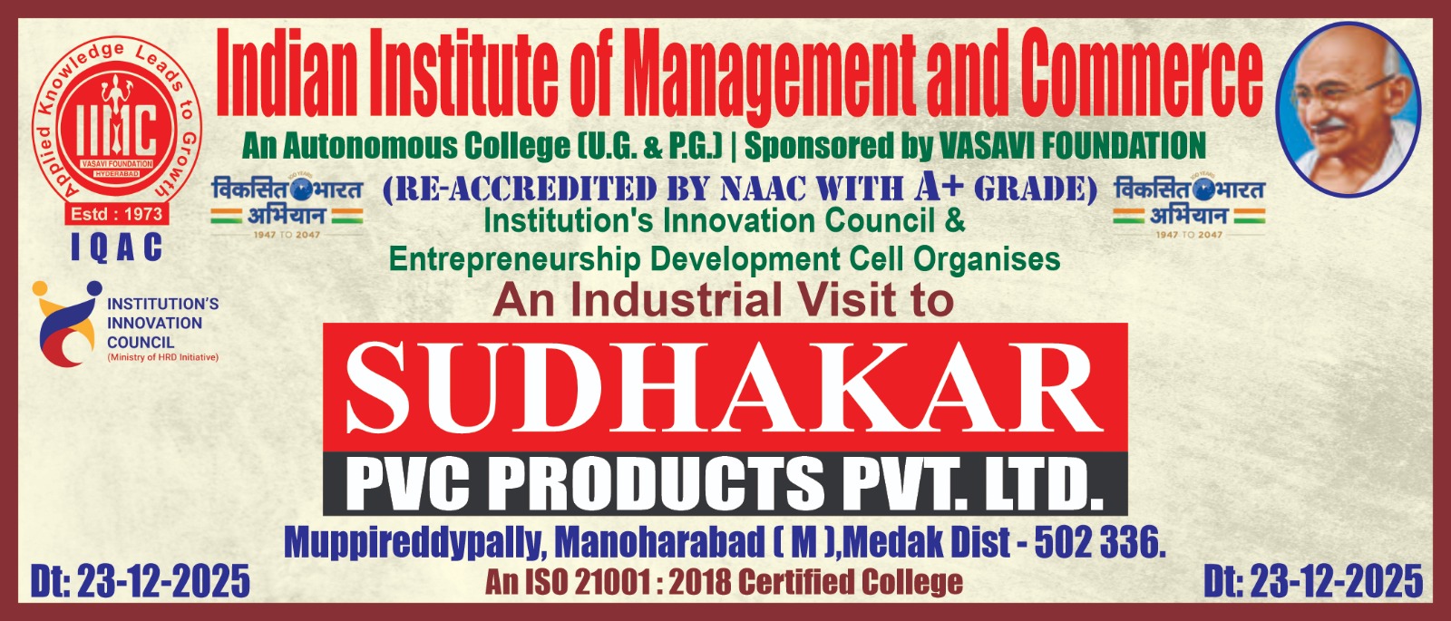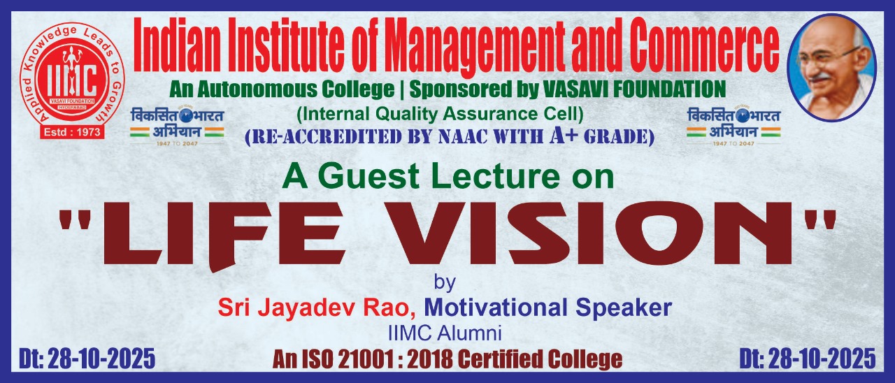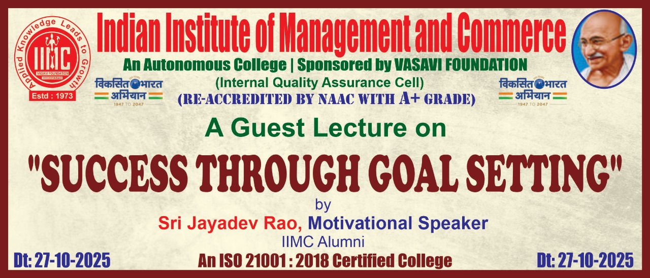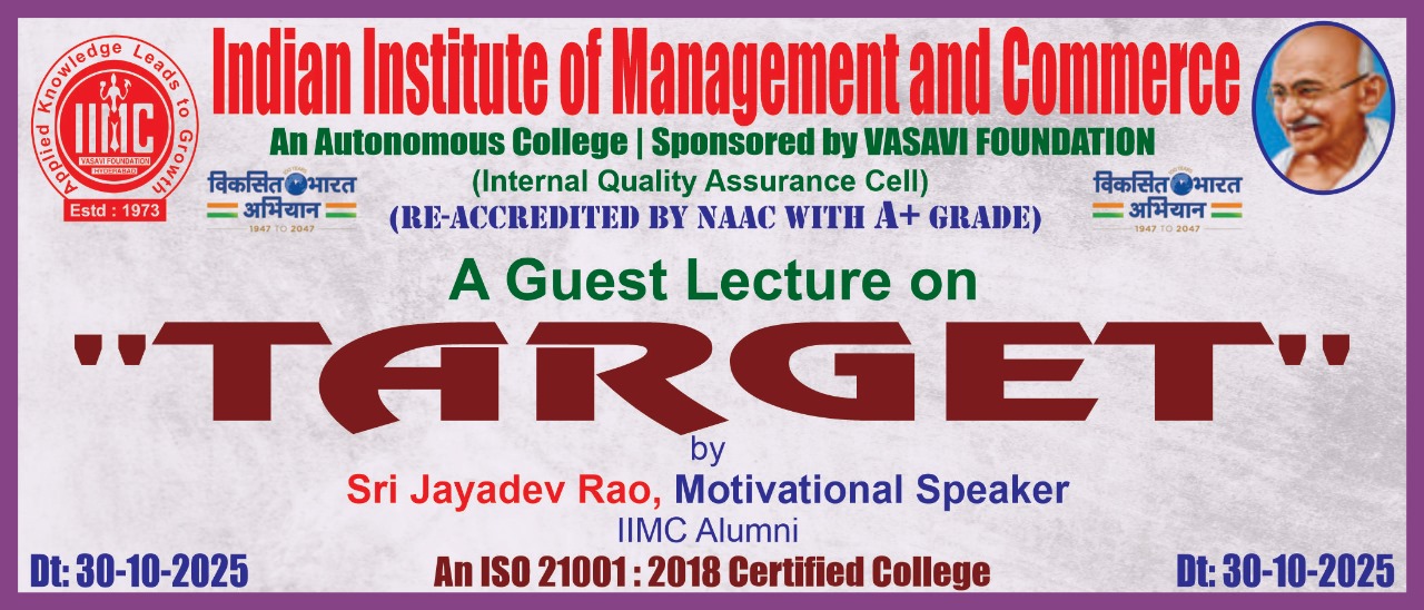 The Indian Institute of Management and Commerce(IIMC) established five decades ago(year 1973) has to its credit some outstanding achievements in the field of Commerce Education in general and Honours course in particular at the Degree level. Eminent social workers and philanthropists and Educationalists like Sri Kothuru Seethaiah Gupta, Sri Challa Som Raj Ram, Sri C.E. Gupta, Sri Dundoo Balanarasaiah, Sri Narayana Chetty IAS(Retd.), Late Sri Veloor Lingaiah Gupta gathered together and laid solid foundation in starting this premier Institution. Members of Vysya Community in particular and admirers of Higher Education in general are greatly beholden to the Founders.