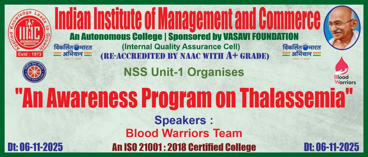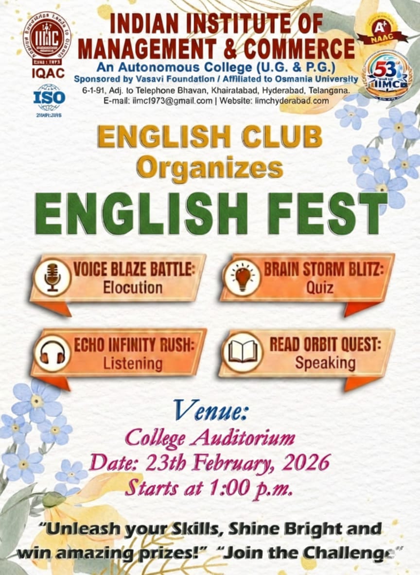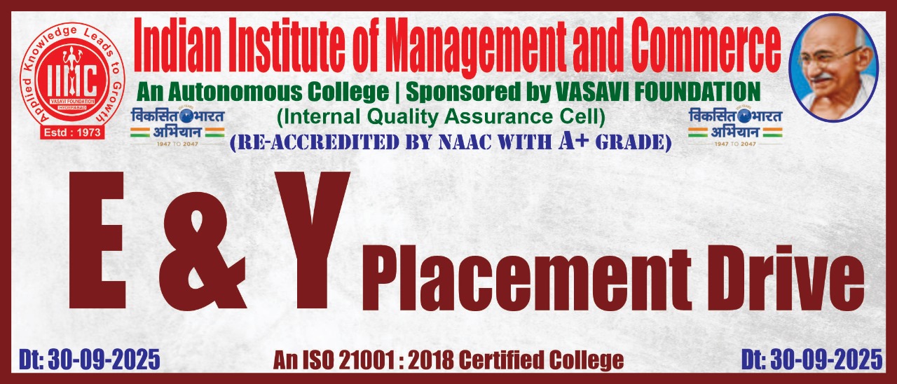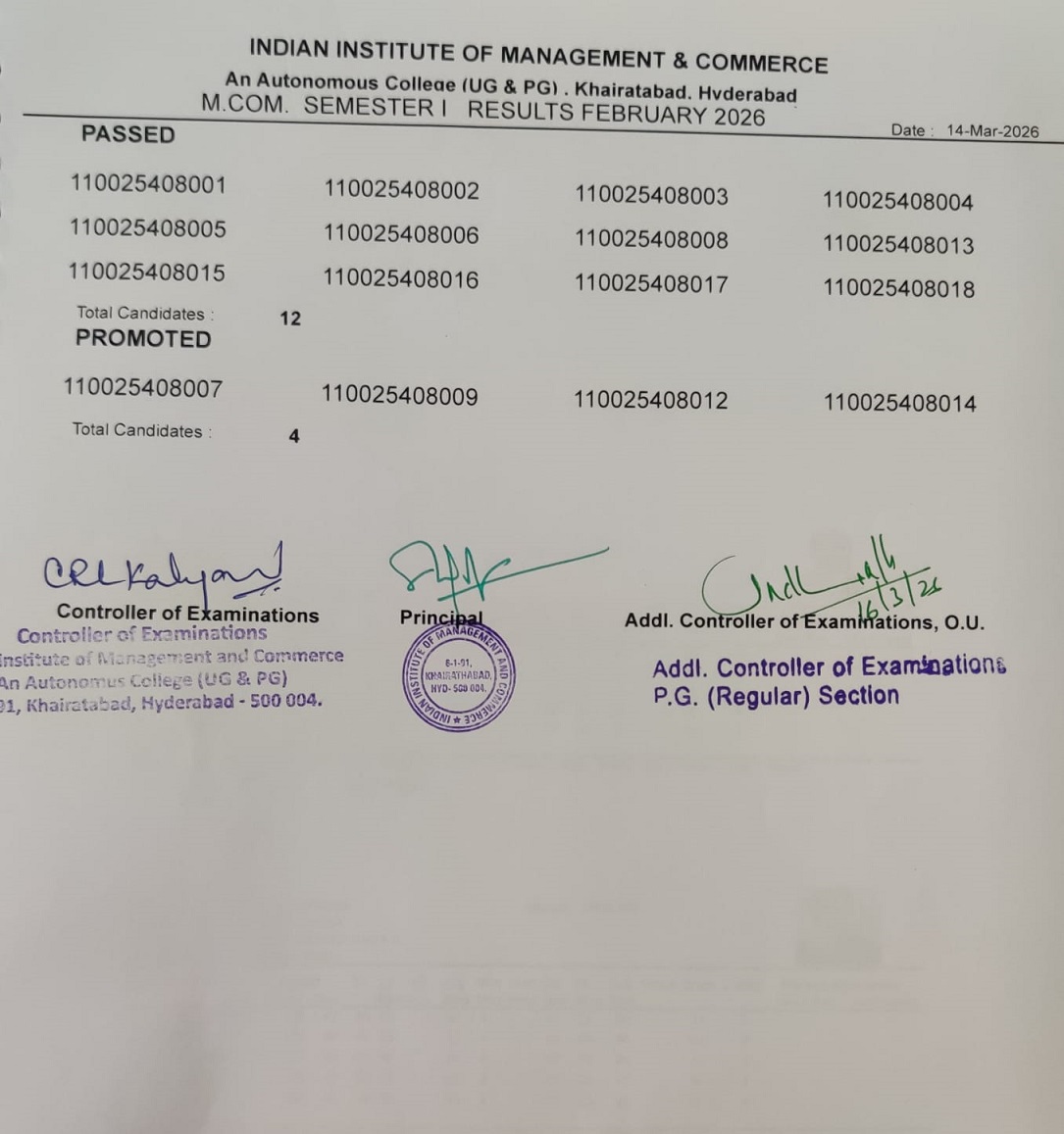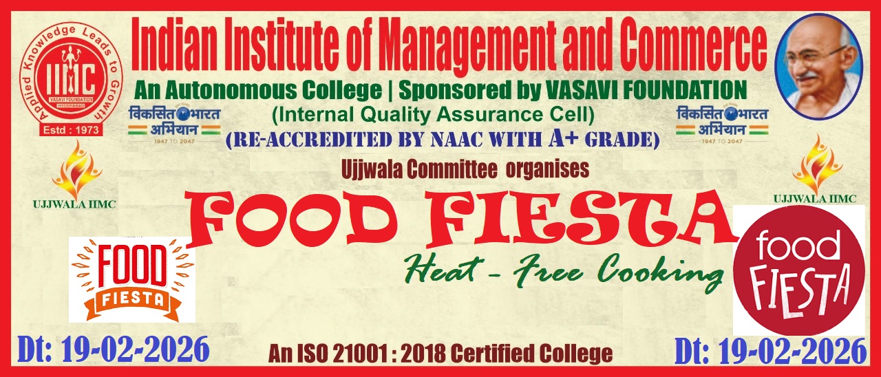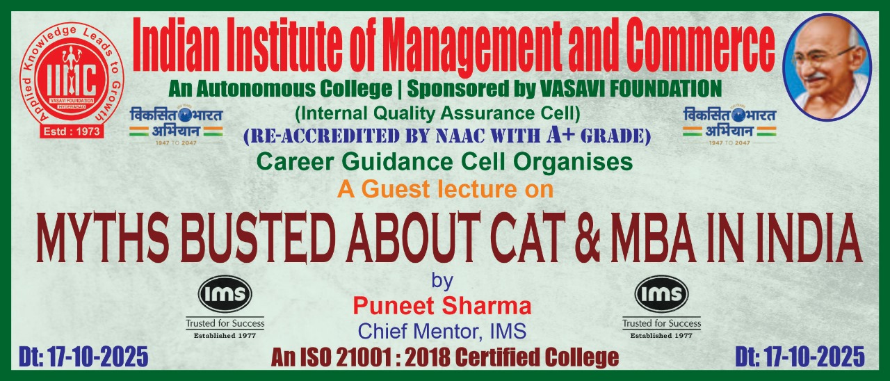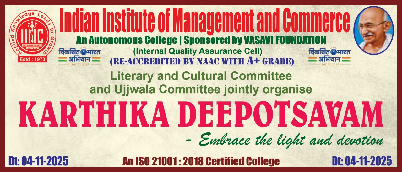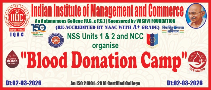 The Indian Institute of Management and Commerce(IIMC) established five decades ago(year 1973) has to its credit some outstanding achievements in the field of Commerce Education in general and Honours course in particular at the Degree level. Eminent social workers and philanthropists and Educationalists like Sri Kothuru Seethaiah Gupta, Sri Challa Som Raj Ram, Sri C.E. Gupta, Sri Dundoo Balanarasaiah, Sri Narayana Chetty IAS(Retd.), Late Sri Veloor Lingaiah Gupta gathered together and laid solid foundation in starting this premier Institution. Members of Vysya Community in particular and admirers of Higher Education in general are greatly beholden to the Founders.