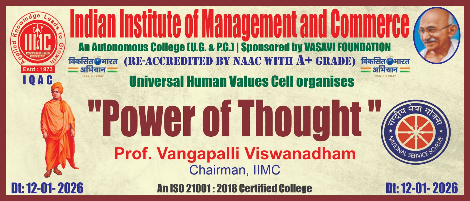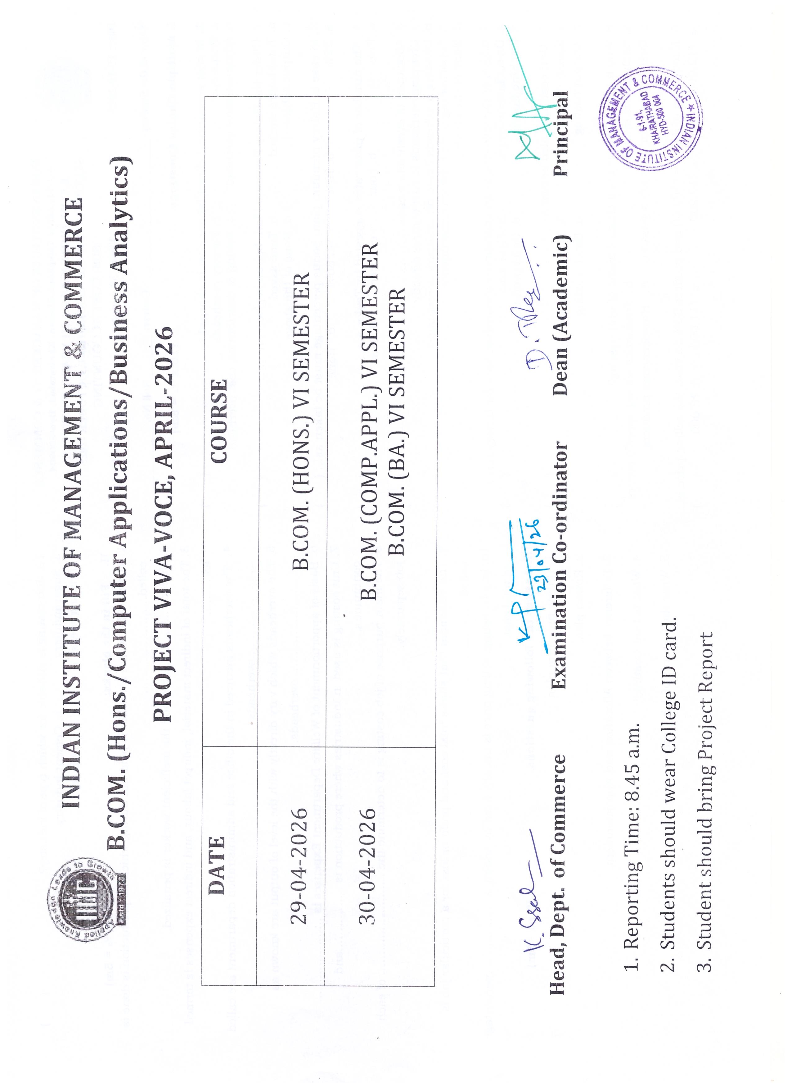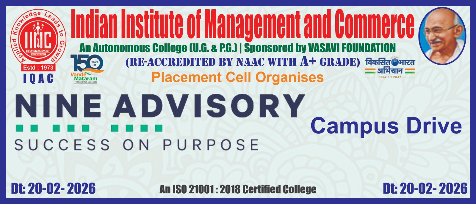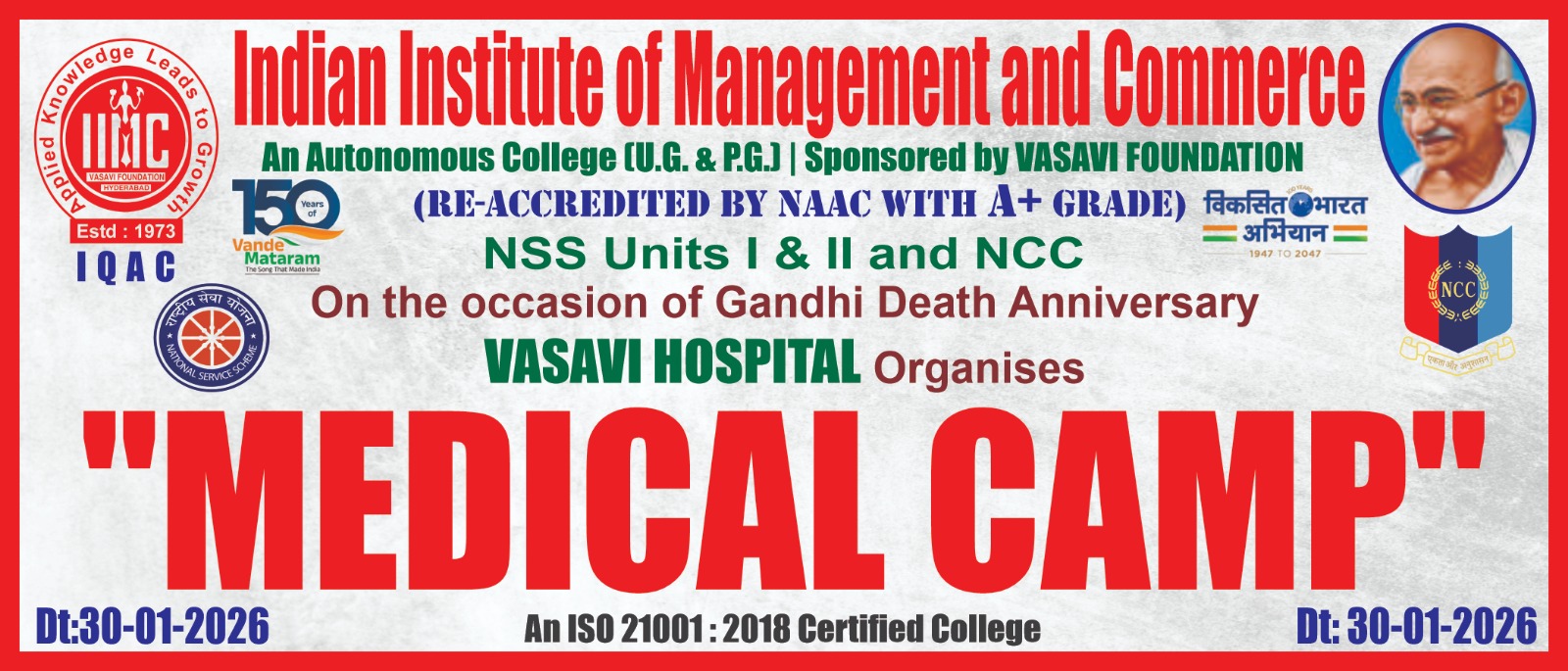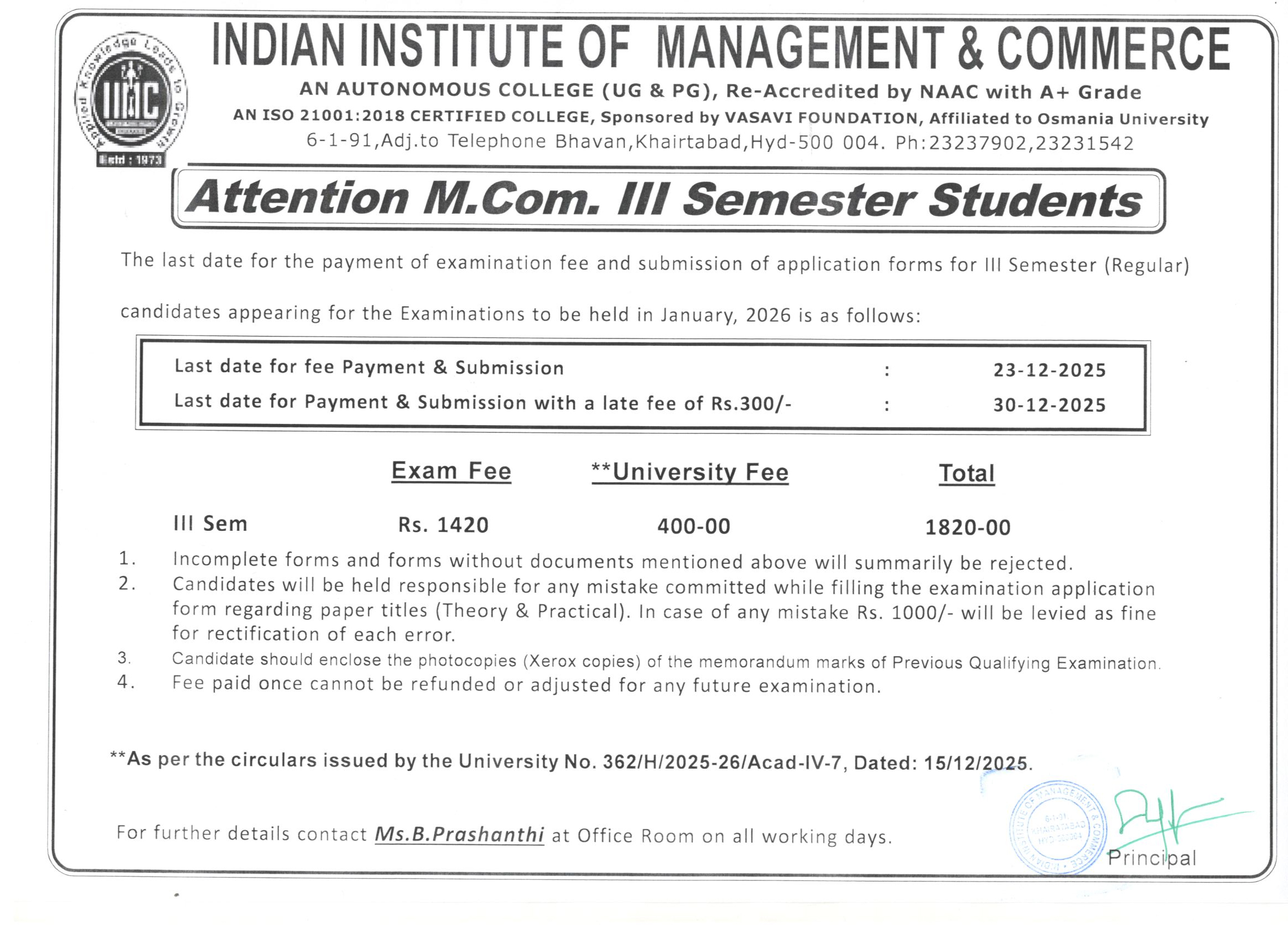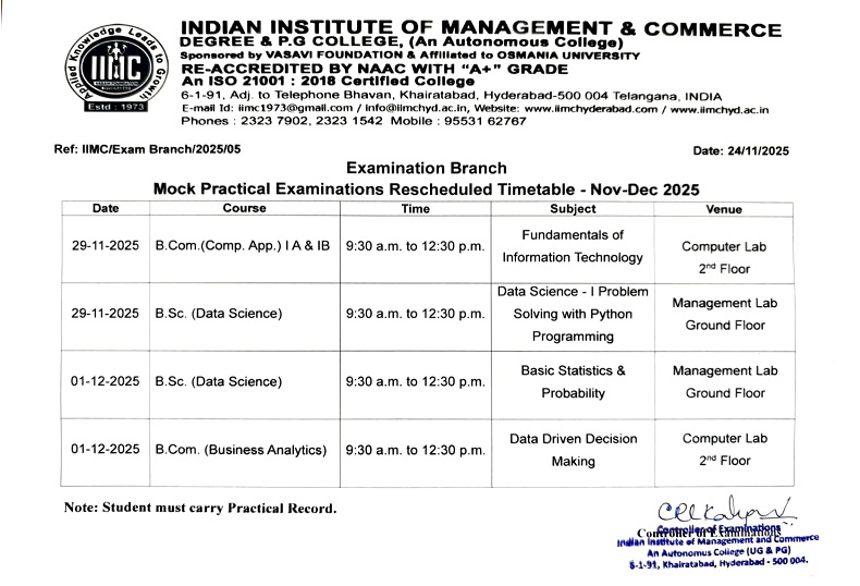 The Indian Institute of Management and Commerce(IIMC) established five decades ago(year 1973) has to its credit some outstanding achievements in the field of Commerce Education in general and Honours course in particular at the Degree level. Eminent social workers and philanthropists and Educationalists like Sri Kothuru Seethaiah Gupta, Sri Challa Som Raj Ram, Sri C.E. Gupta, Sri Dundoo Balanarasaiah, Sri Narayana Chetty IAS(Retd.), Late Sri Veloor Lingaiah Gupta gathered together and laid solid foundation in starting this premier Institution. Members of Vysya Community in particular and admirers of Higher Education in general are greatly beholden to the Founders.