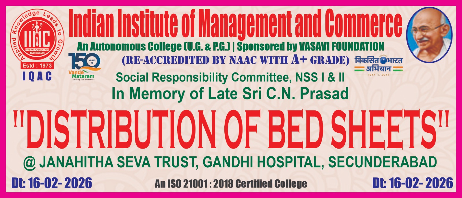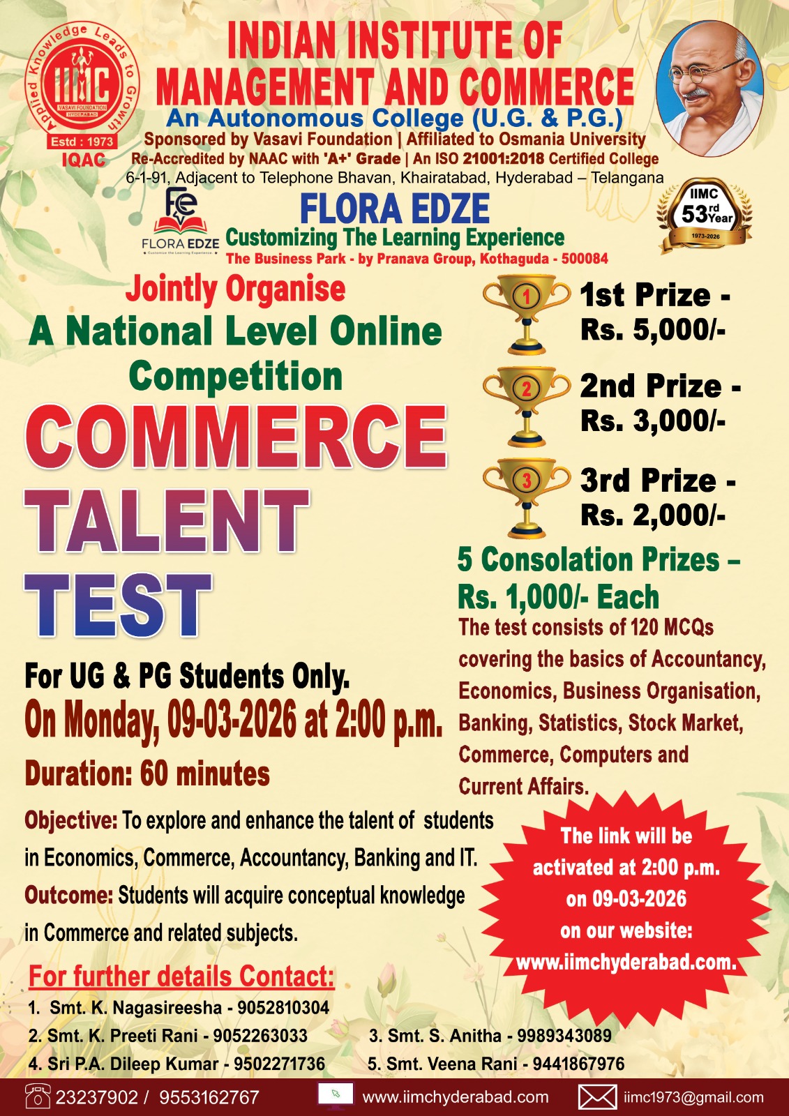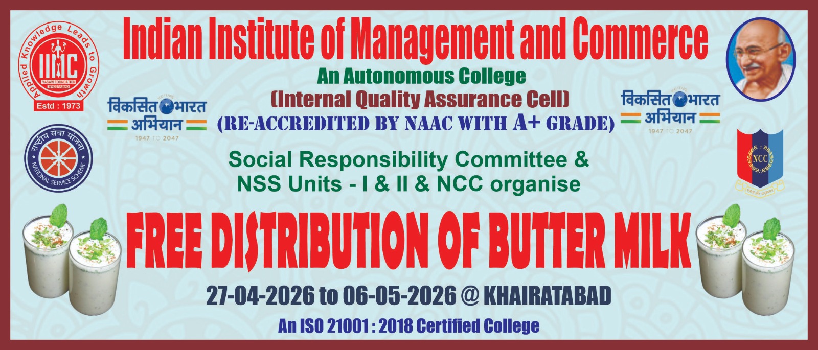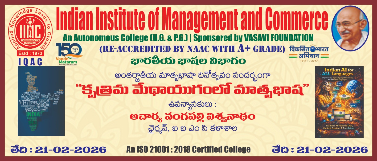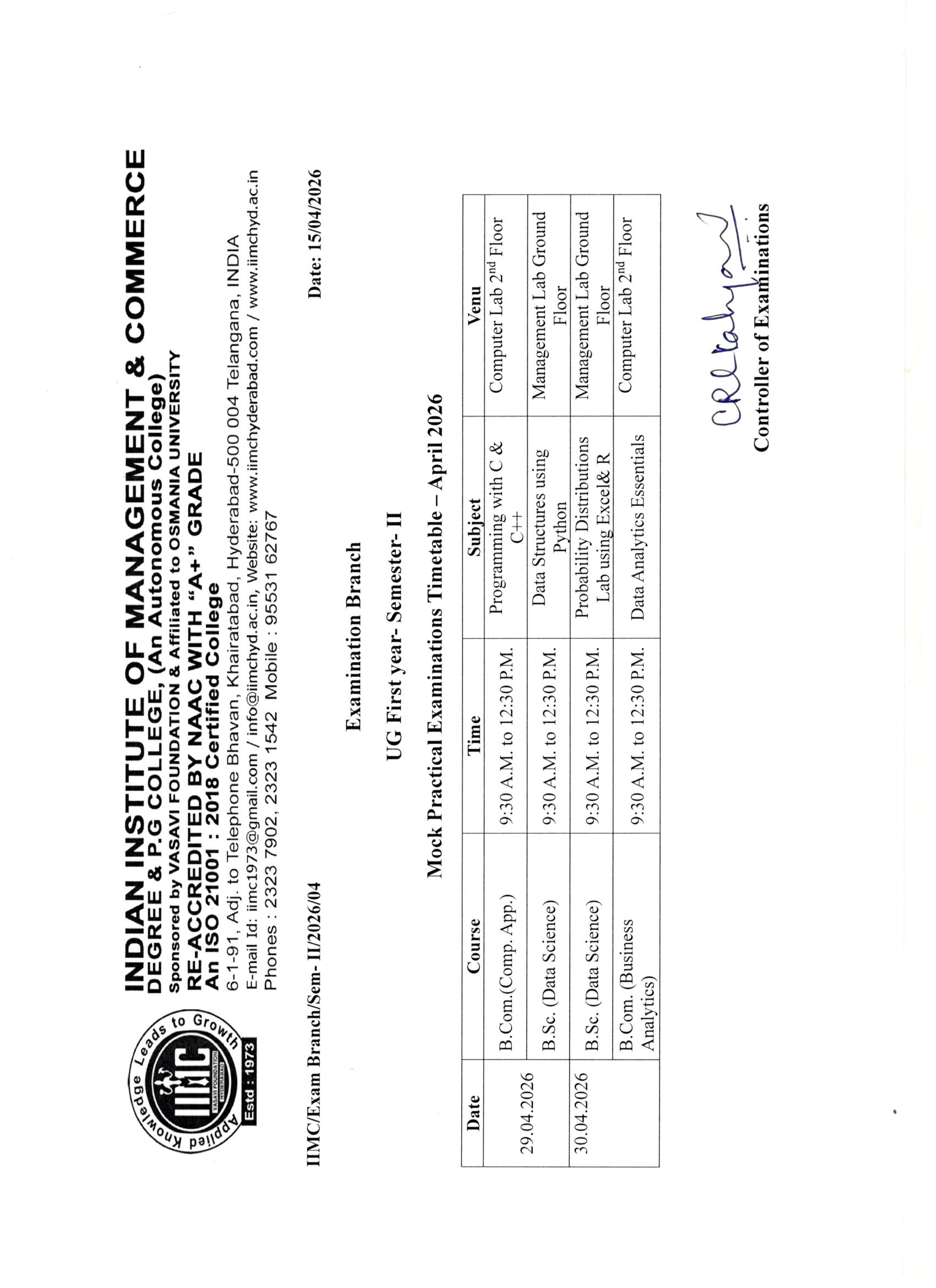 The Indian Institute of Management and Commerce(IIMC) established five decades ago(year 1973) has to its credit some outstanding achievements in the field of Commerce Education in general and Honours course in particular at the Degree level. Eminent social workers and philanthropists and Educationalists like Sri Kothuru Seethaiah Gupta, Sri Challa Som Raj Ram, Sri C.E. Gupta, Sri Dundoo Balanarasaiah, Sri Narayana Chetty IAS(Retd.), Late Sri Veloor Lingaiah Gupta gathered together and laid solid foundation in starting this premier Institution. Members of Vysya Community in particular and admirers of Higher Education in general are greatly beholden to the Founders.