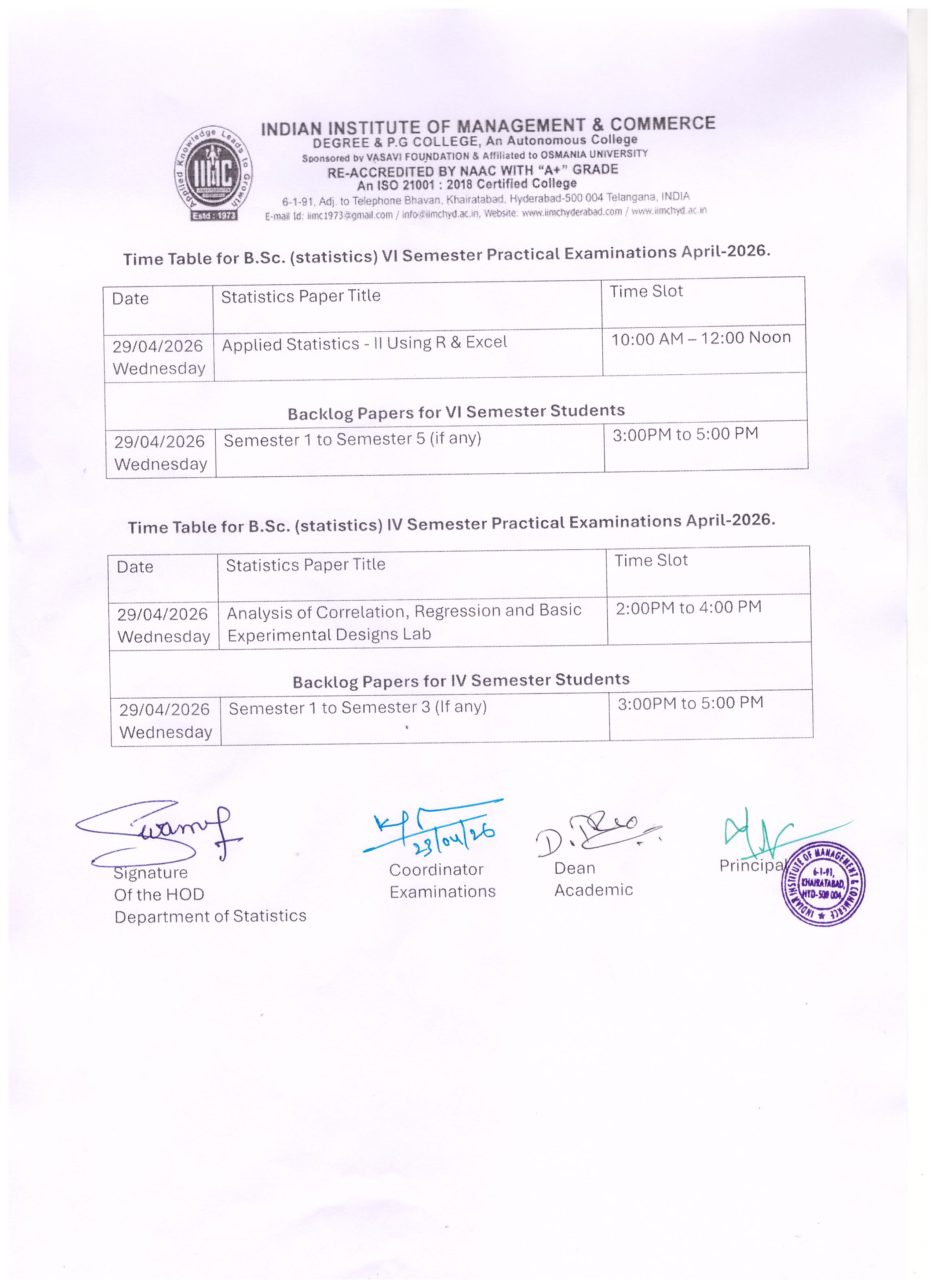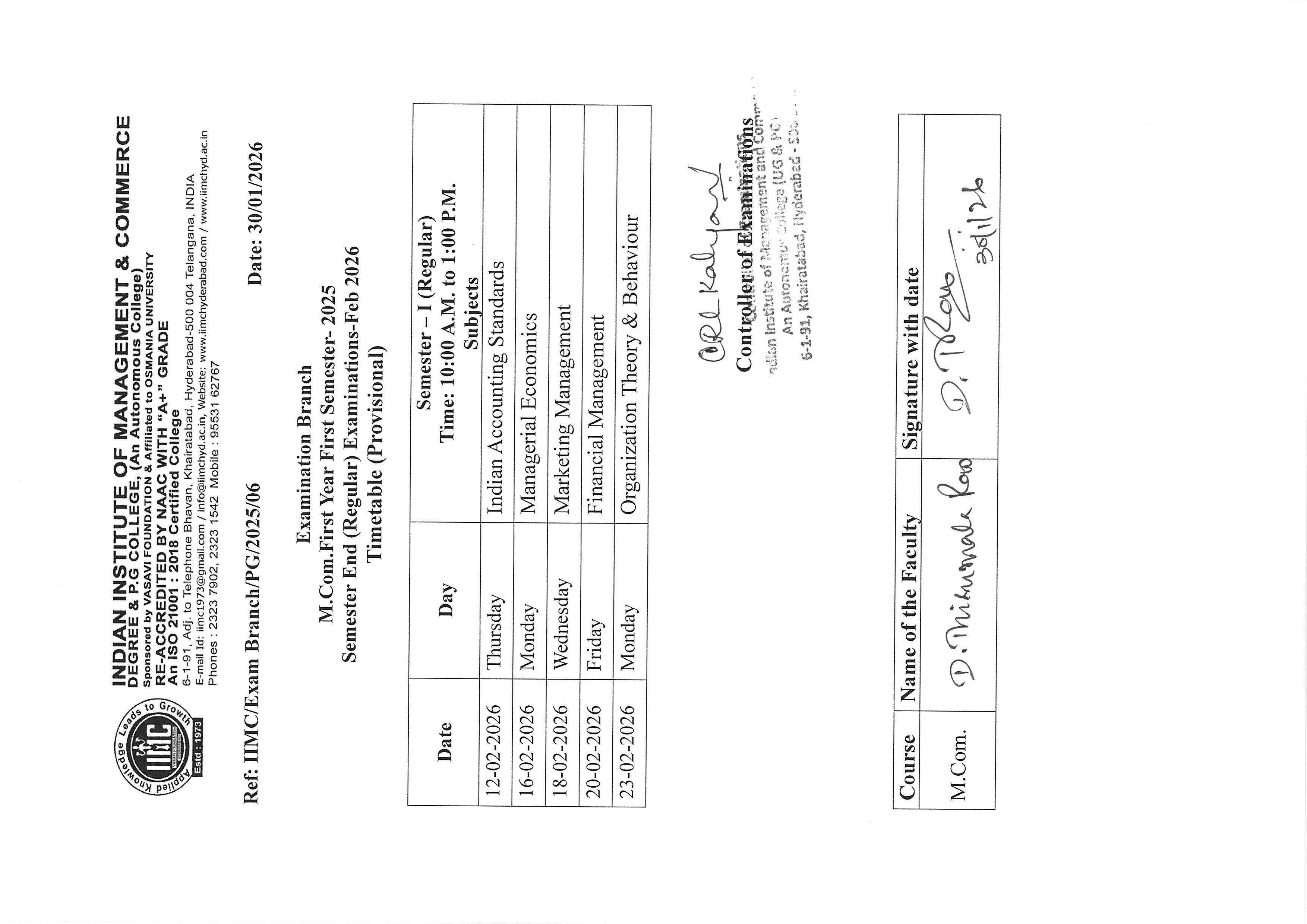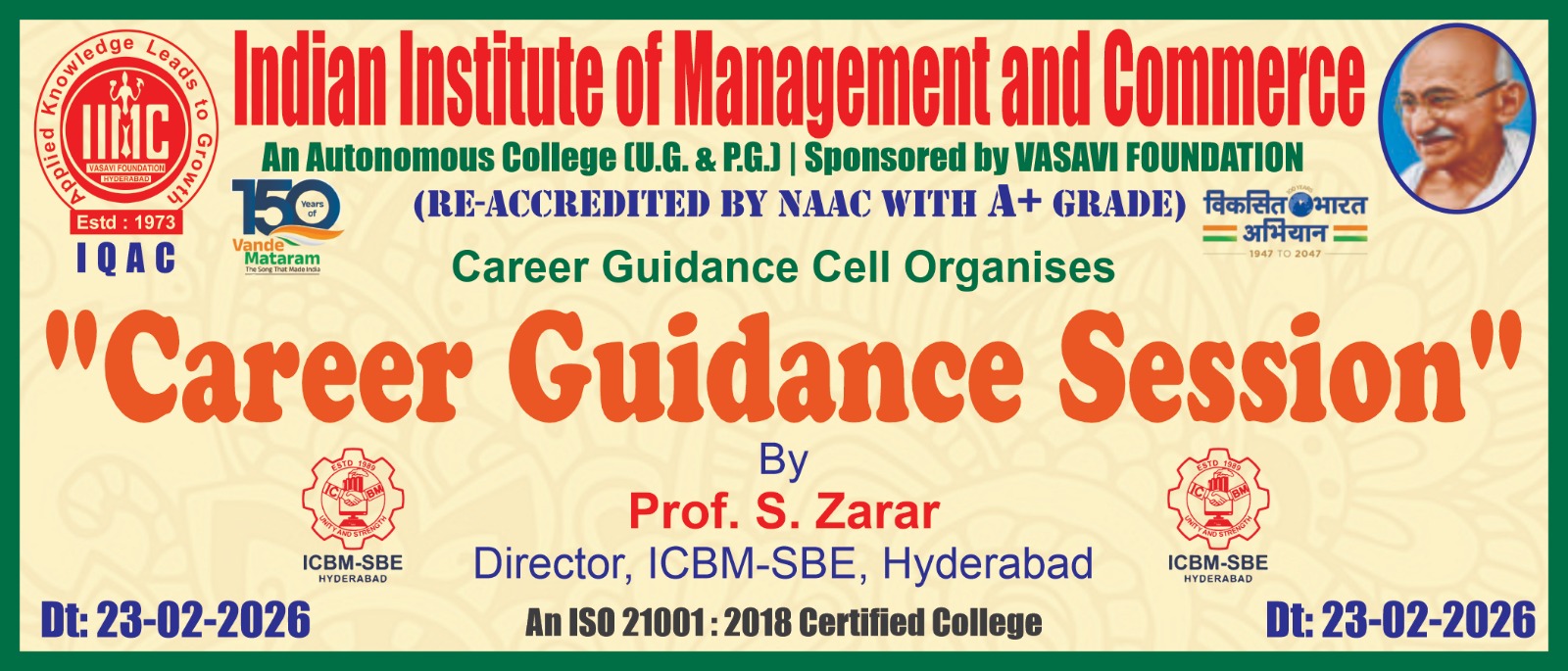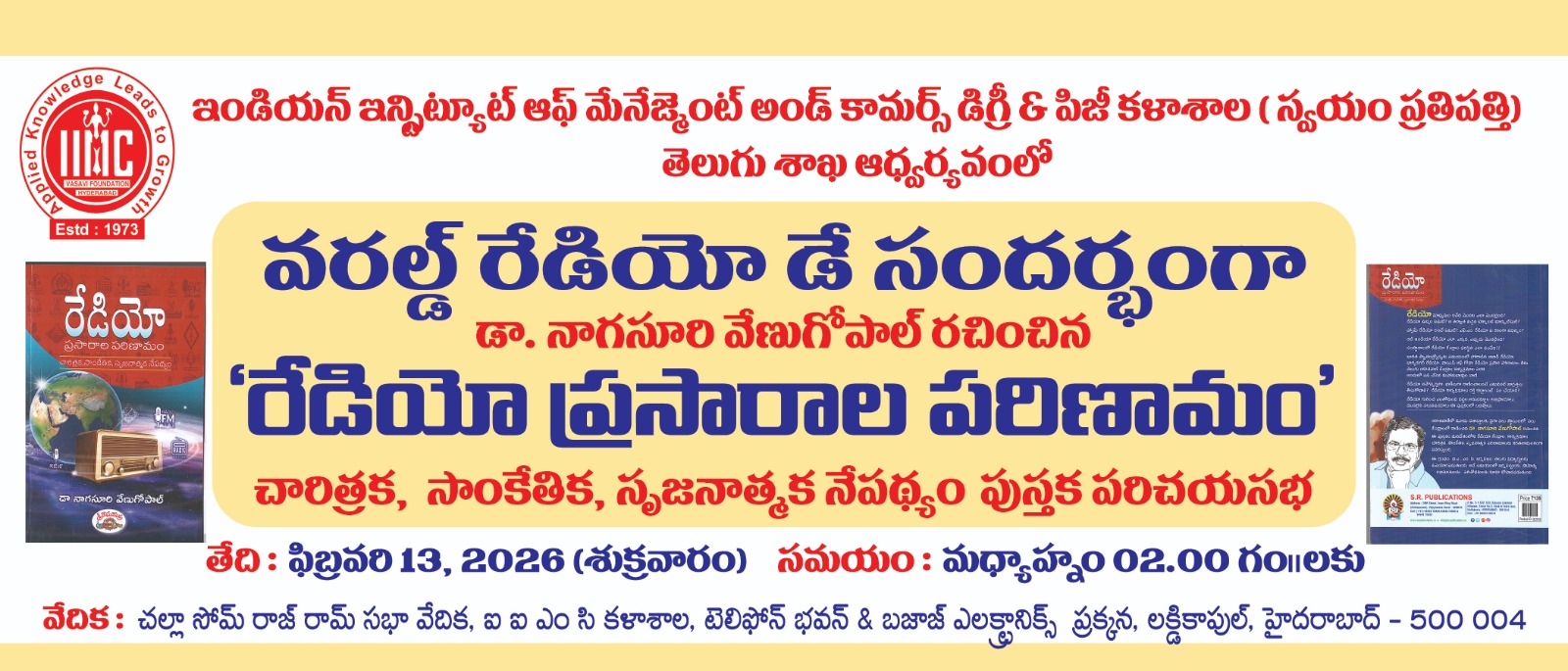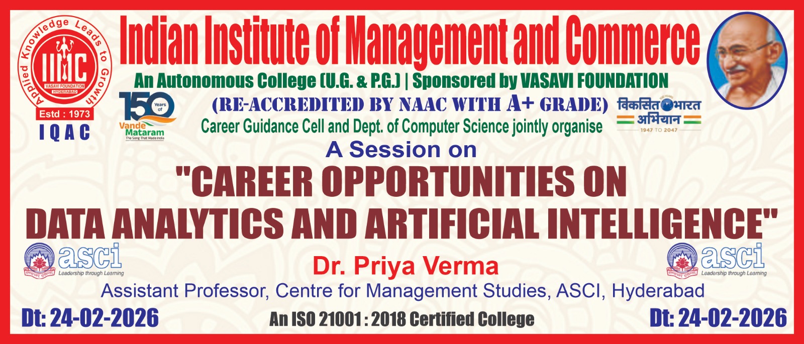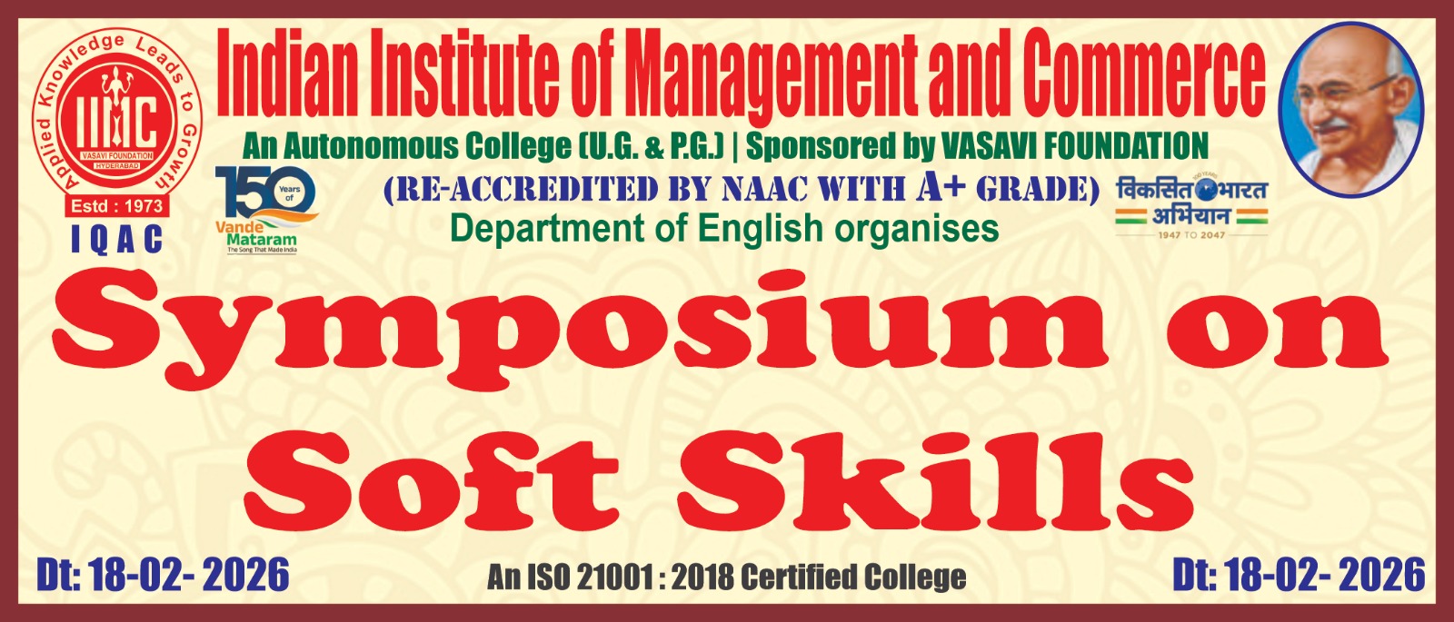 The Indian Institute of Management and Commerce(IIMC) established five decades ago(year 1973) has to its credit some outstanding achievements in the field of Commerce Education in general and Honours course in particular at the Degree level. Eminent social workers and philanthropists and Educationalists like Sri Kothuru Seethaiah Gupta, Sri Challa Som Raj Ram, Sri C.E. Gupta, Sri Dundoo Balanarasaiah, Sri Narayana Chetty IAS(Retd.), Late Sri Veloor Lingaiah Gupta gathered together and laid solid foundation in starting this premier Institution. Members of Vysya Community in particular and admirers of Higher Education in general are greatly beholden to the Founders.
