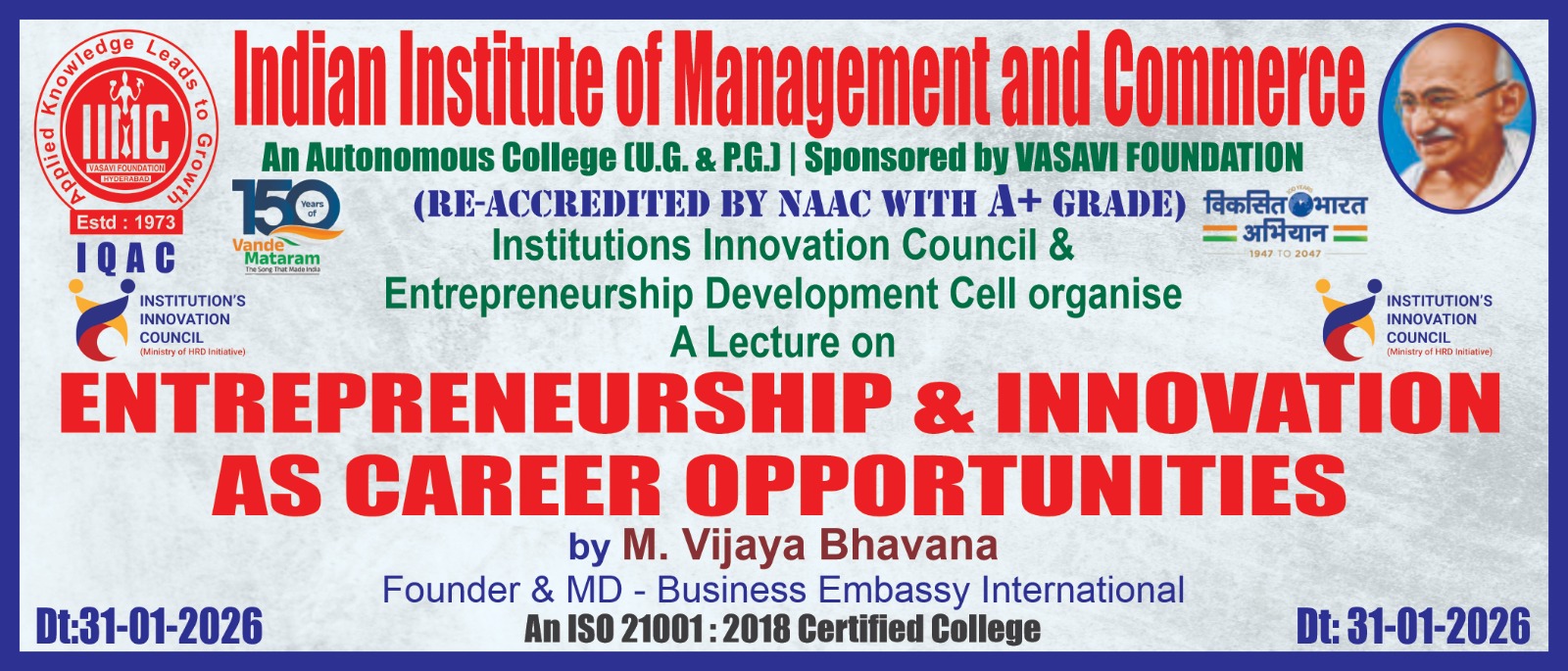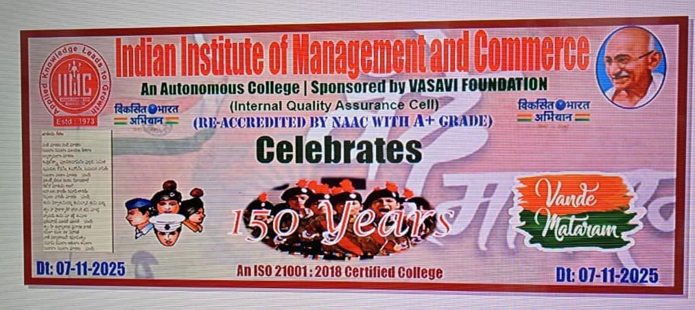 The Indian Institute of Management and Commerce(IIMC) established five decades ago(year 1973) has to its credit some outstanding achievements in the field of Commerce Education in general and Honours course in particular at the Degree level. Eminent social workers and philanthropists and Educationalists like Sri Kothuru Seethaiah Gupta, Sri Challa Som Raj Ram, Sri C.E. Gupta, Sri Dundoo Balanarasaiah, Sri Narayana Chetty IAS(Retd.), Late Sri Veloor Lingaiah Gupta gathered together and laid solid foundation in starting this premier Institution. Members of Vysya Community in particular and admirers of Higher Education in general are greatly beholden to the Founders.